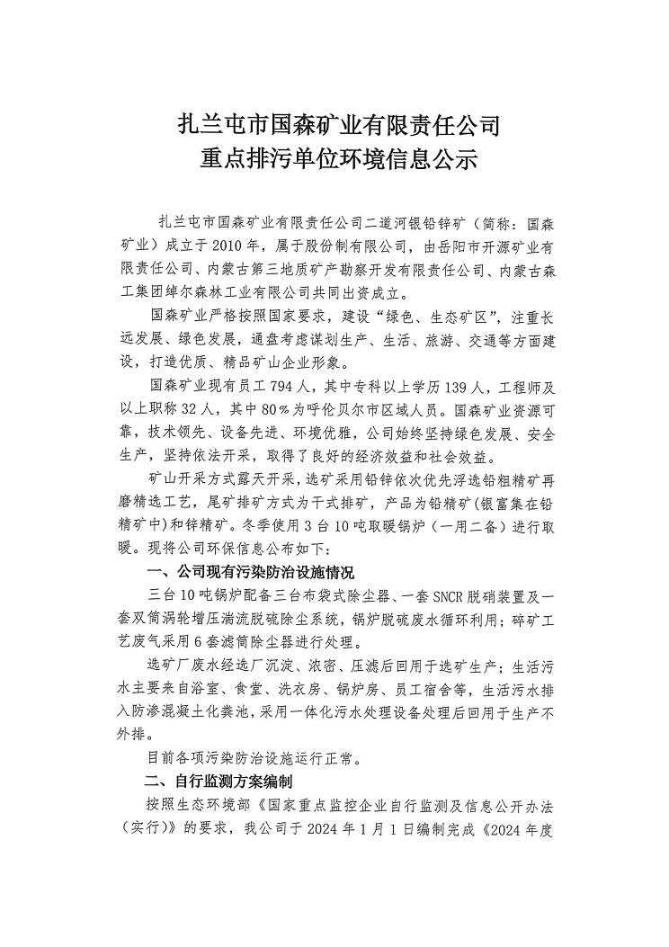 扎蘭屯市國森礦業(yè)有限責(zé)任公司重點排污單位環(huán)境信息公示